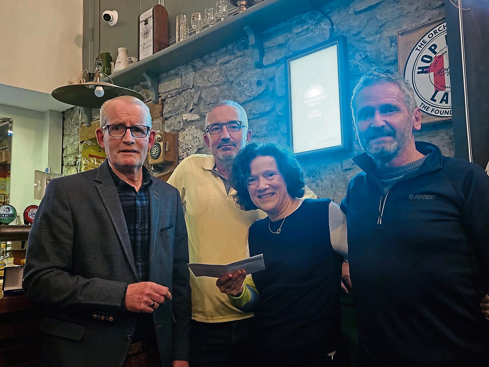 Pictured presenting a cheque for €5,000 to the O’Neill Centre from the Floodlit League were Eamon Cleere, John Dalton (sponsor), Terèse Healy (O’Neill Centre) and Gerry O’Keeffe.