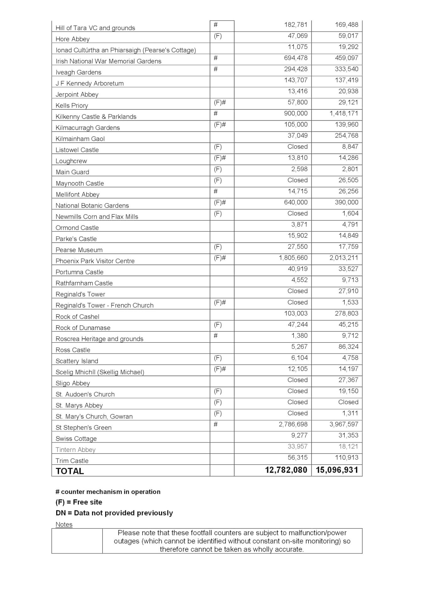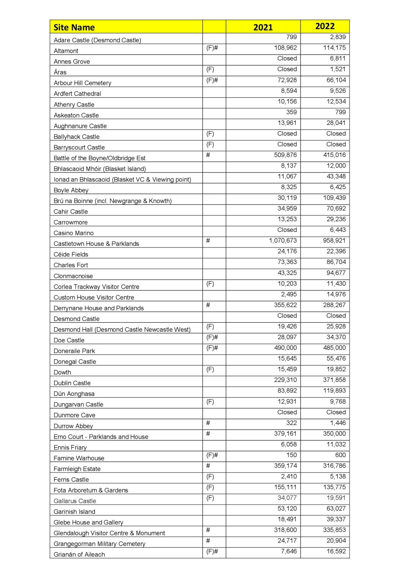 The 2022 visitor numbers for OPW-managed sites with a facility to record visitor numbers are attached or can be viewed at www.opw.ie