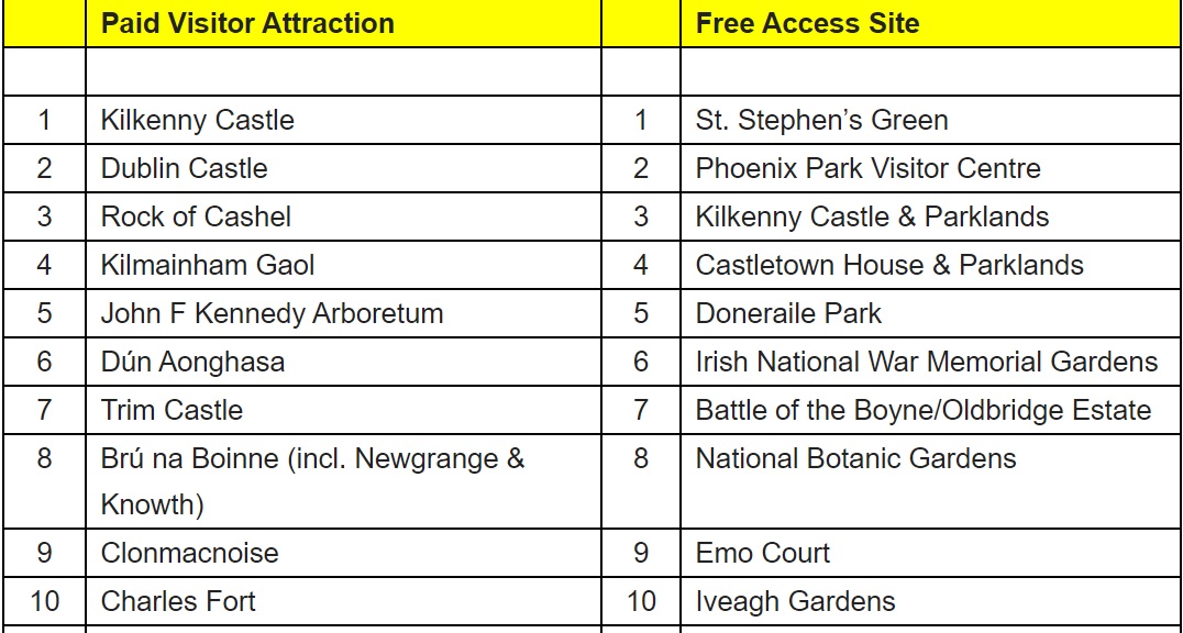 “It is wonderful to see that these sites are doing so well, both the paid attractions, which reflects very well on Ireland’s tourism performance, as well as the sites, parks and gardens which the public can access for free year round. Every heritage site contributes to the local sense of place, the local economy and is a precious and unique place to discover for visitors of all ages and interests,” he said.