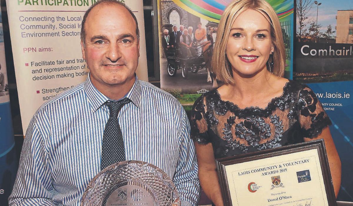 Unsung Hero, Donal O'Shea (StradballyCommunity Assoc./SVT/Electric Picnic ) with RTE'S Claire Byrne at the 2019 Laois Community & Voluntary Awards. Photo: Michael Scully