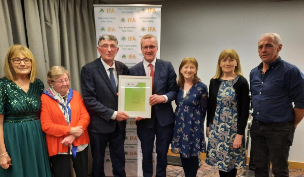 Michael Bergin receives the award from Tim Culinan, IFA President, surrounded by his wife Mary and sisters Sadie, Mary and Anne. Also pictured is Tom Meade Chairman of Mounthrath IFA Branch at the M