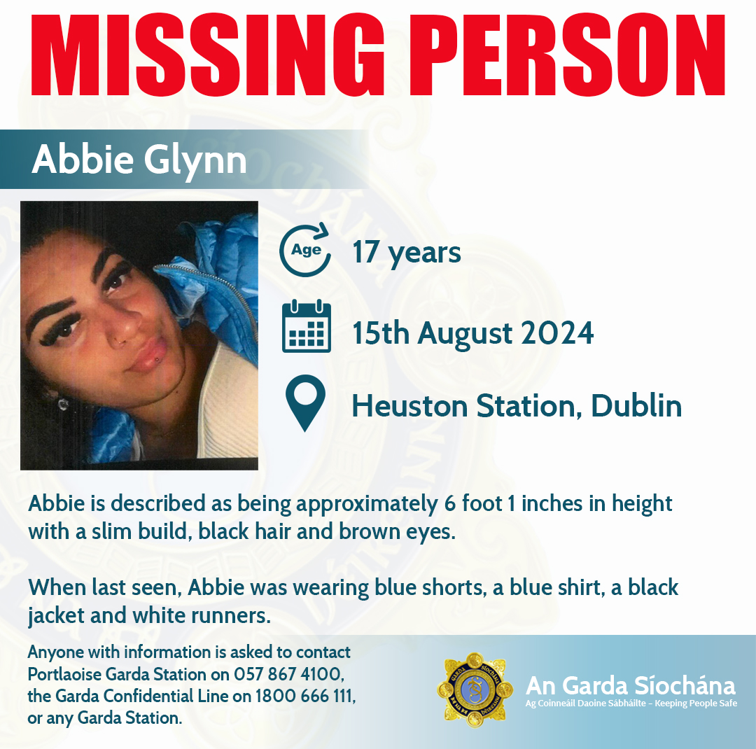 Anyone with any information on Abbie’s whereabouts is asked to contact Portlaoise Garda Station on 057 867 4100, the Garda Confidential Line on 1800 666 111, or any Garda Station.