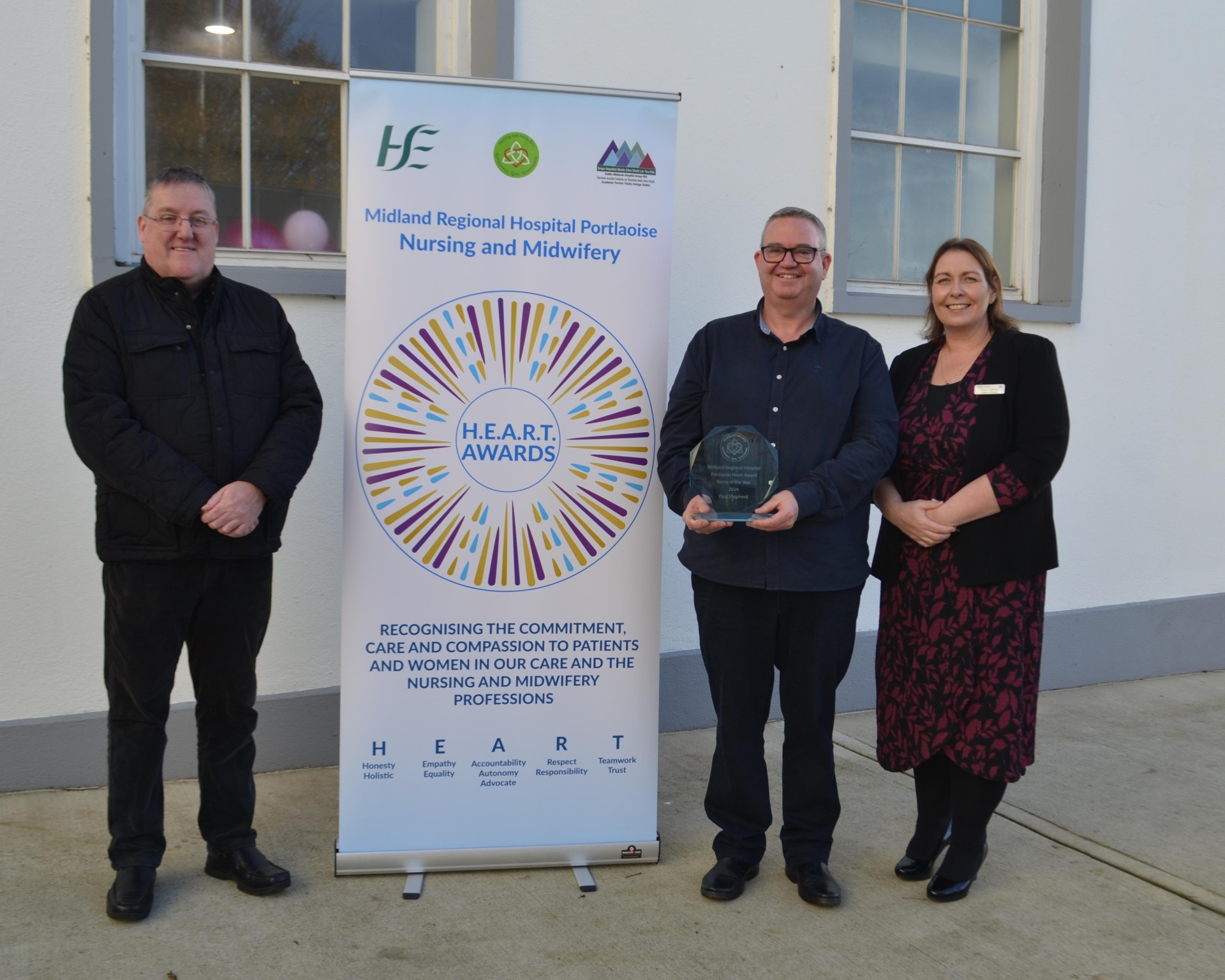 Nurse of the Year- Paul Shepherd, Senior Staff Nurse with John Joyce, General Manager and Olivia Lafferty, Director of Nursing, MRHP.