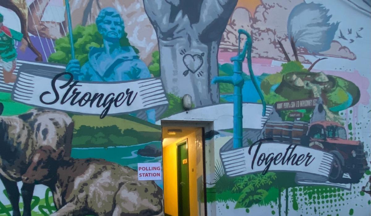 The town's Polling Station is located in the Parochial Hall on the Square. It's decorated with a mural which features farming, and sporting scene as well as a fist grasping a paintbrush carries the message Stronger Together.