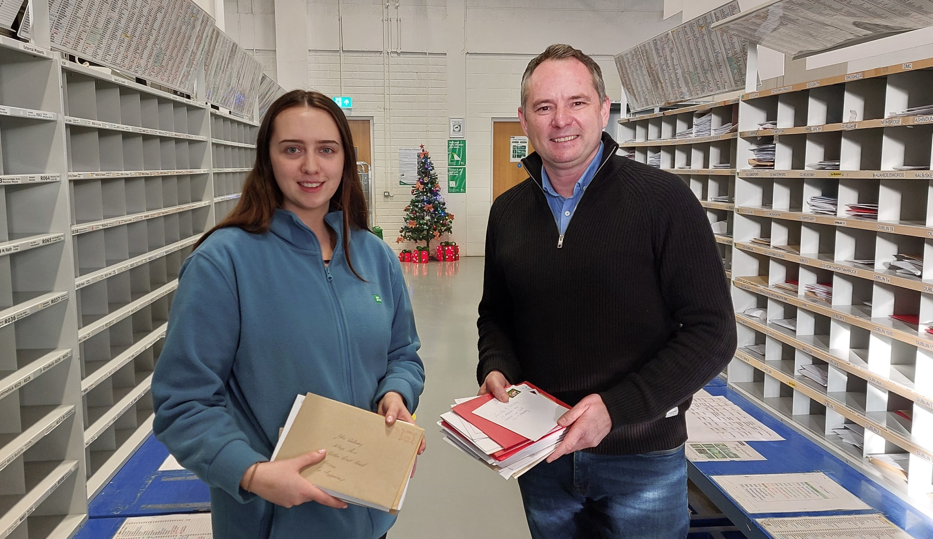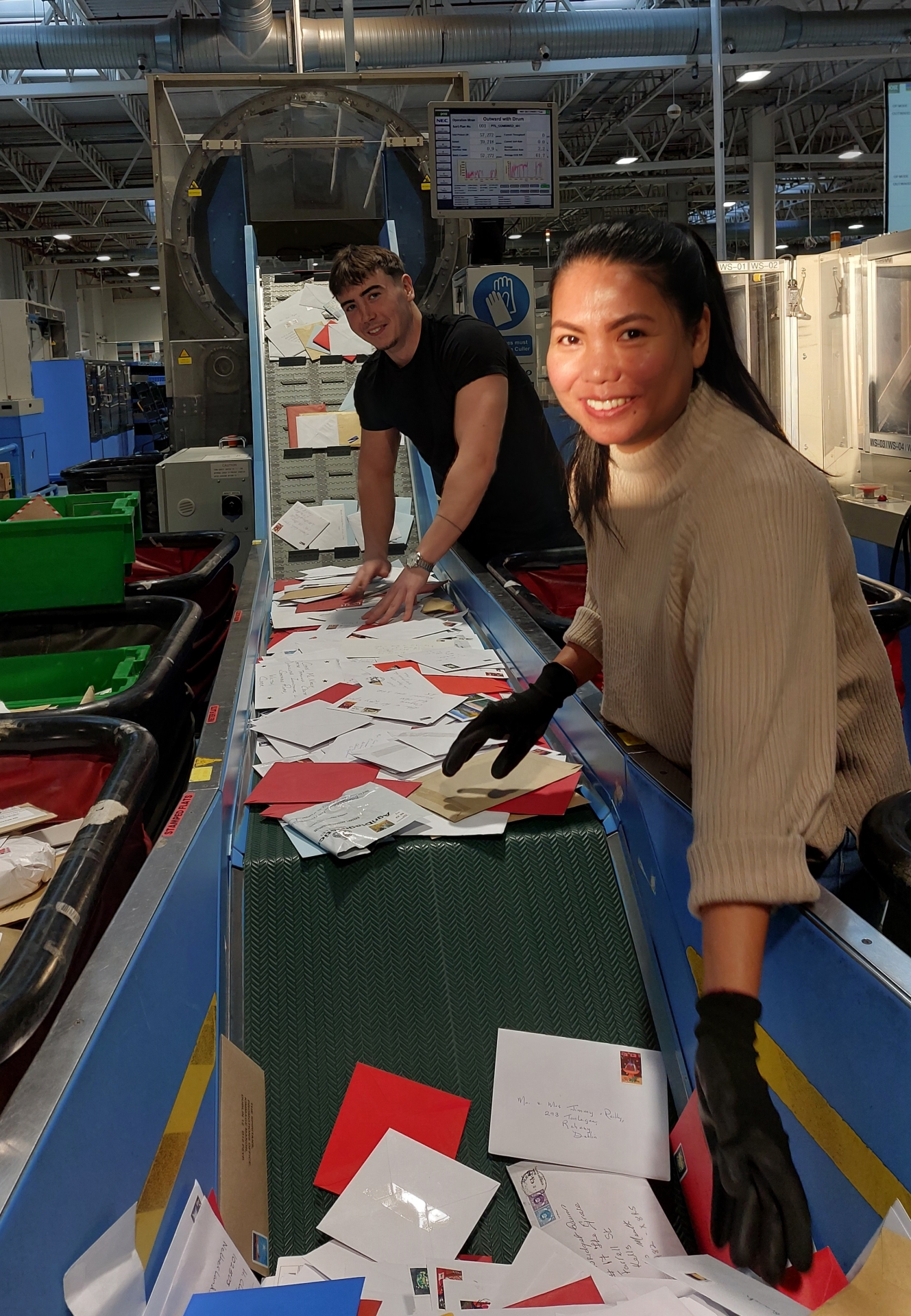 Paul Flanagan and Glai Galindez on the Christmas post sorting line.