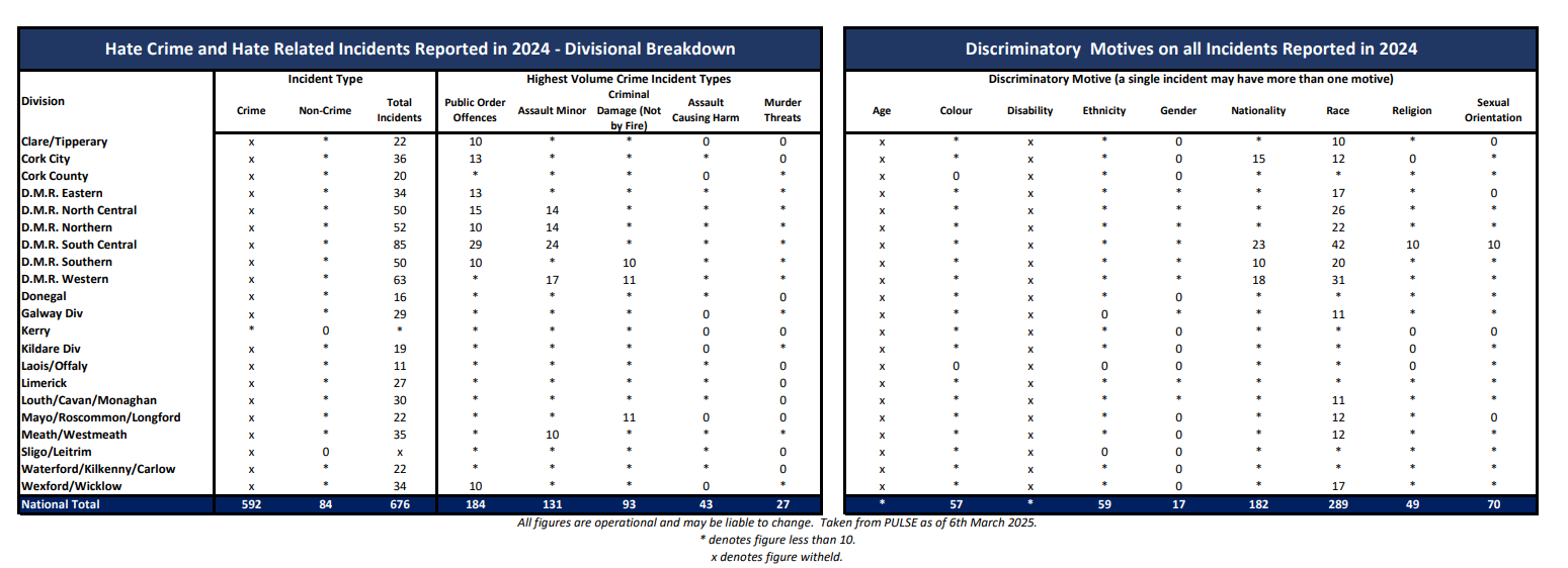 A total 676 hate crimes and hate related (non-crime) incidents were recorded in Ireland in 2024 - up from 651 in 2023
