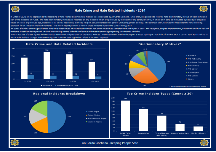 An Garda Síochána published figures on Hate Crimes and Hate Related (non-crime) Incidents reported during 2024 earlier today.
