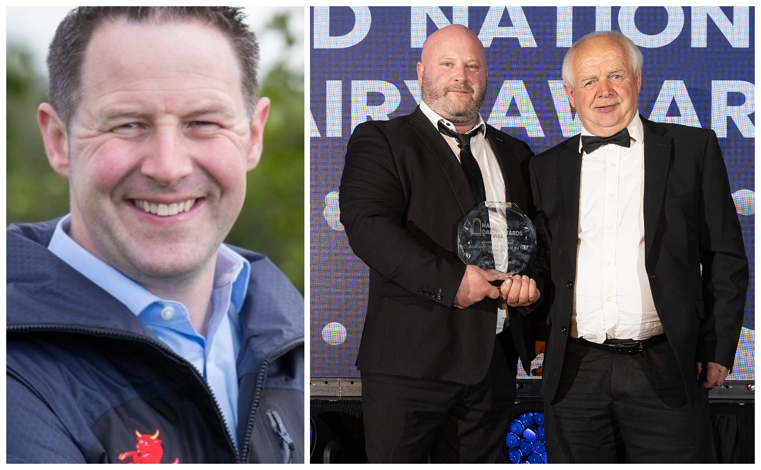 Pictured inset is Bruce Thompson. The main picture features Bruce's dad, Ian, picking up the award, on his son's behalf, for Kerry Dairy Ireland Biodiversity Dairy Farmer of the Year from James O'Connell of Kerry Dairy Ireland.