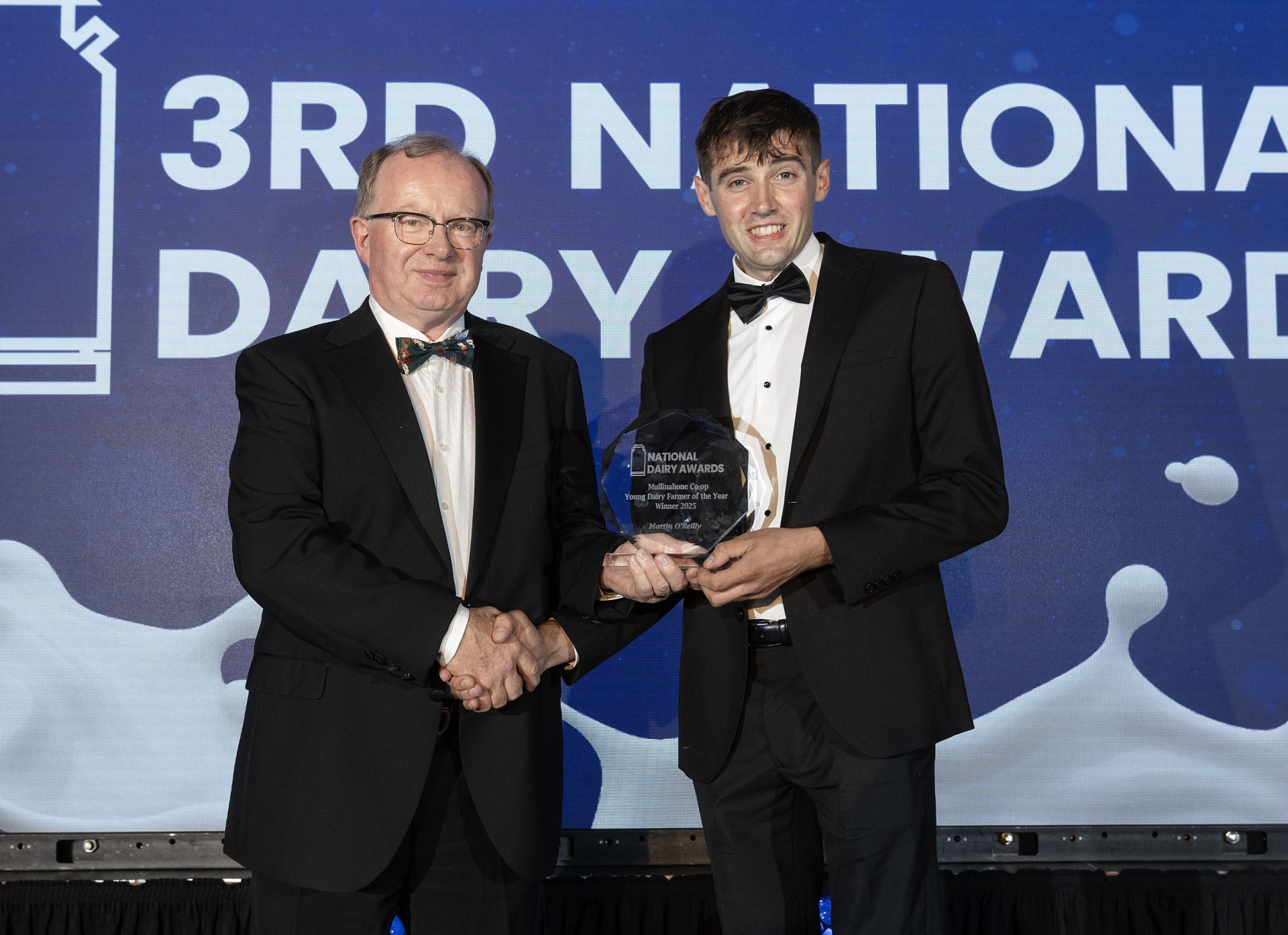 Martin O'Reilly receiving his Mullinahone Co-op Young Dairy Farmer of the Year award from Martin Ryan, CEO of Mullinahone Co-op.
