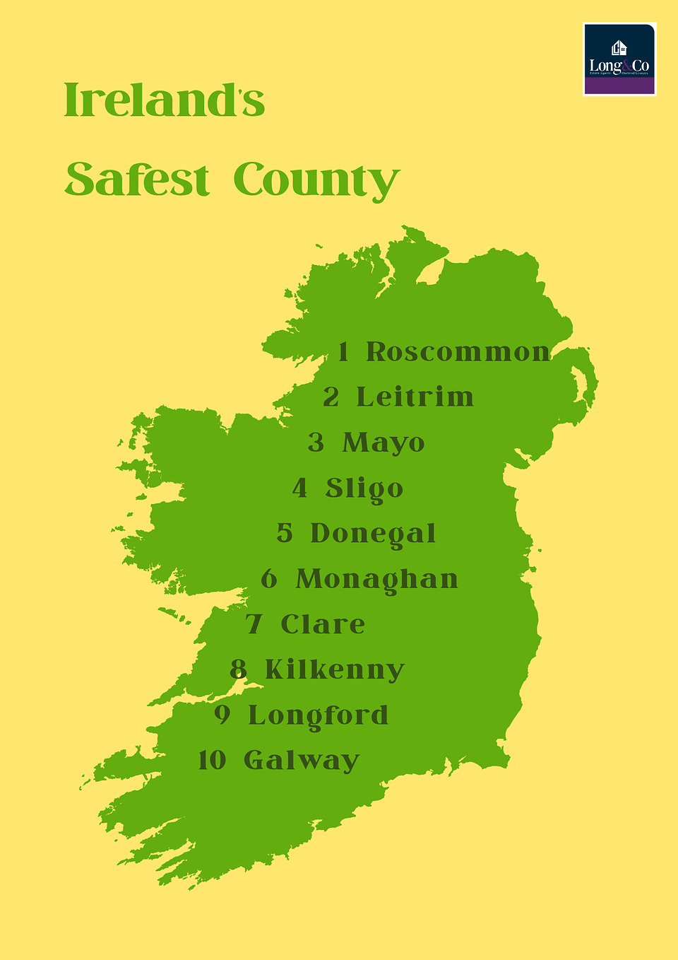 “The results are great for Roscommon,” Ronán Long, founder of Long & Co. said, “which as we all know boasts superb scenery, attractions and activities for all. For those looking for their forever home, the likes of Roscommon Town, Boyle and Castlerea are top choices. Of course, much like the rest of Ireland, housing is in demand, although I’m sure these new safety figures will really catch buyers’ attention.”
