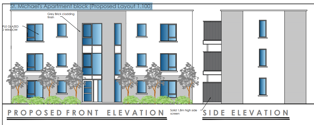 They applied for “permission to carry out development which will consist of permission to extend and renovate St. Michael’s and St. Helena’s apartment blocks. The amendments will include removal of roof on both blocks, additional storey with flat roof, amendments to elevations, amendments to internal layouts to provide 12 no. x 1-bed apartments, new bin and bike store and all associated site works”.