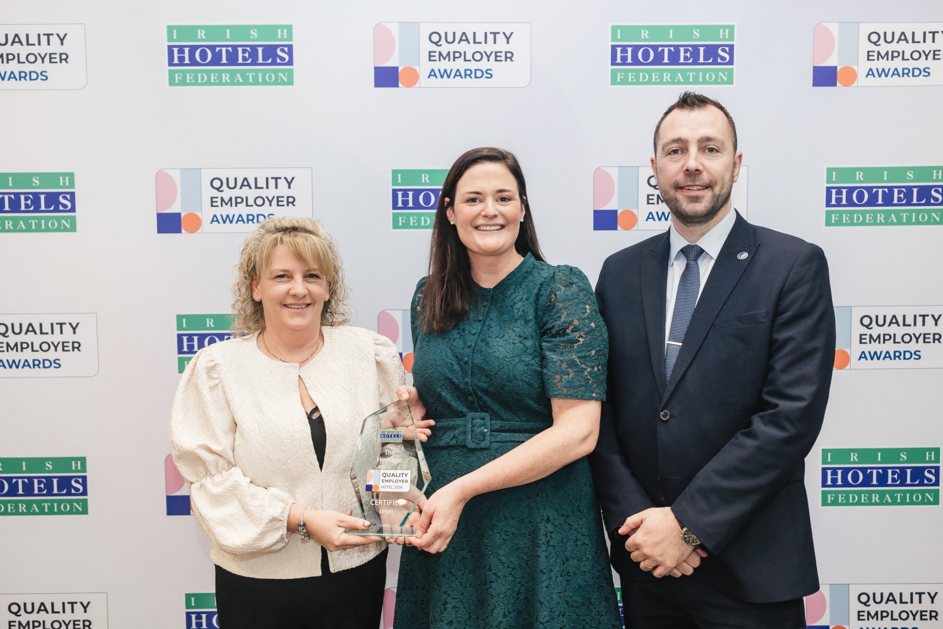 Pictured: Jennifer Crimmons and Jason Jordan from The Heritage pictured with Irish Hotels Federation (IHF) Director of People Services, Deirdre Fitzsimons at the awards ceremony.