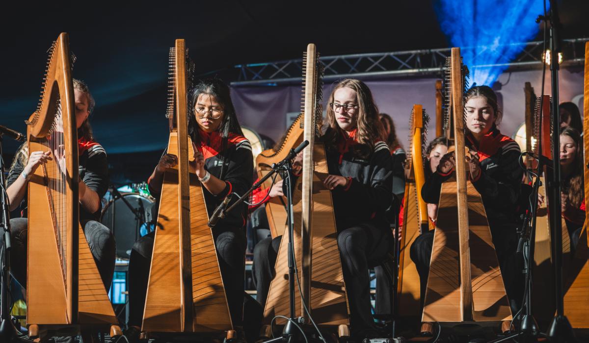 Laois musicians were part of the Music Generation Ireland Harp collective to perform at Fleadh Cheoil na hEireann in Wexford 2025. Photo: Claire Loughran