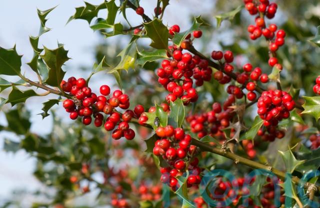 The most popular evergreen at Christmas, famed for its bright red berries and prickly leaves, holly can be found in gardens all over the country. Choose a female variety as that bears the berries (it should say on the label), because holly is dioecious, having male and female reproductive organs in separate individuals.