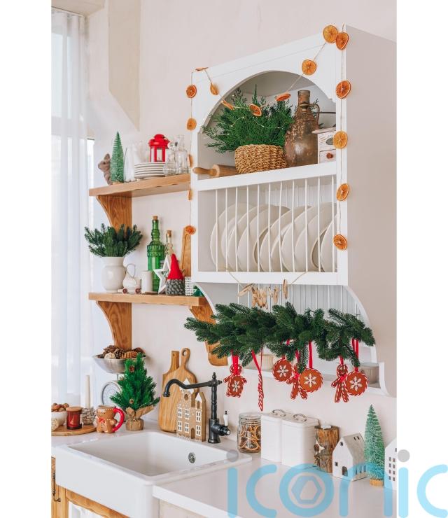 “Hang garlands with fairy lights along cabinet tops, display a small Christmas tree on the worktop, and fill glass jars with ornaments or cranberries.