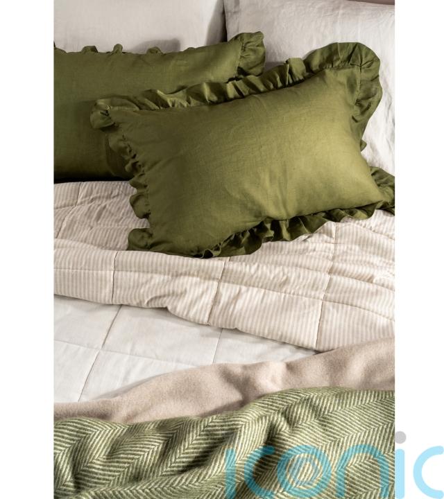 8. Olive Green Ruffled French Linen Standard Oxford Pillowcases, £26.60 (Pair), was £38, Soak & Sleep