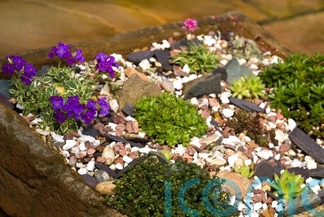 Limestone chippings, black pebbles and even coloured glass chippings can bring an alpine trough to life.