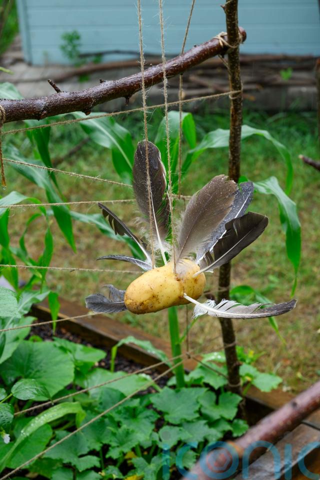 “Basically you take an old potato, stick feathers in it, then use a skewer to make a hole through the middle of it, get a piece of string and thread it through and tie the potato up, suspending it over your crops. It moves in the wind and scares birds,” he says.