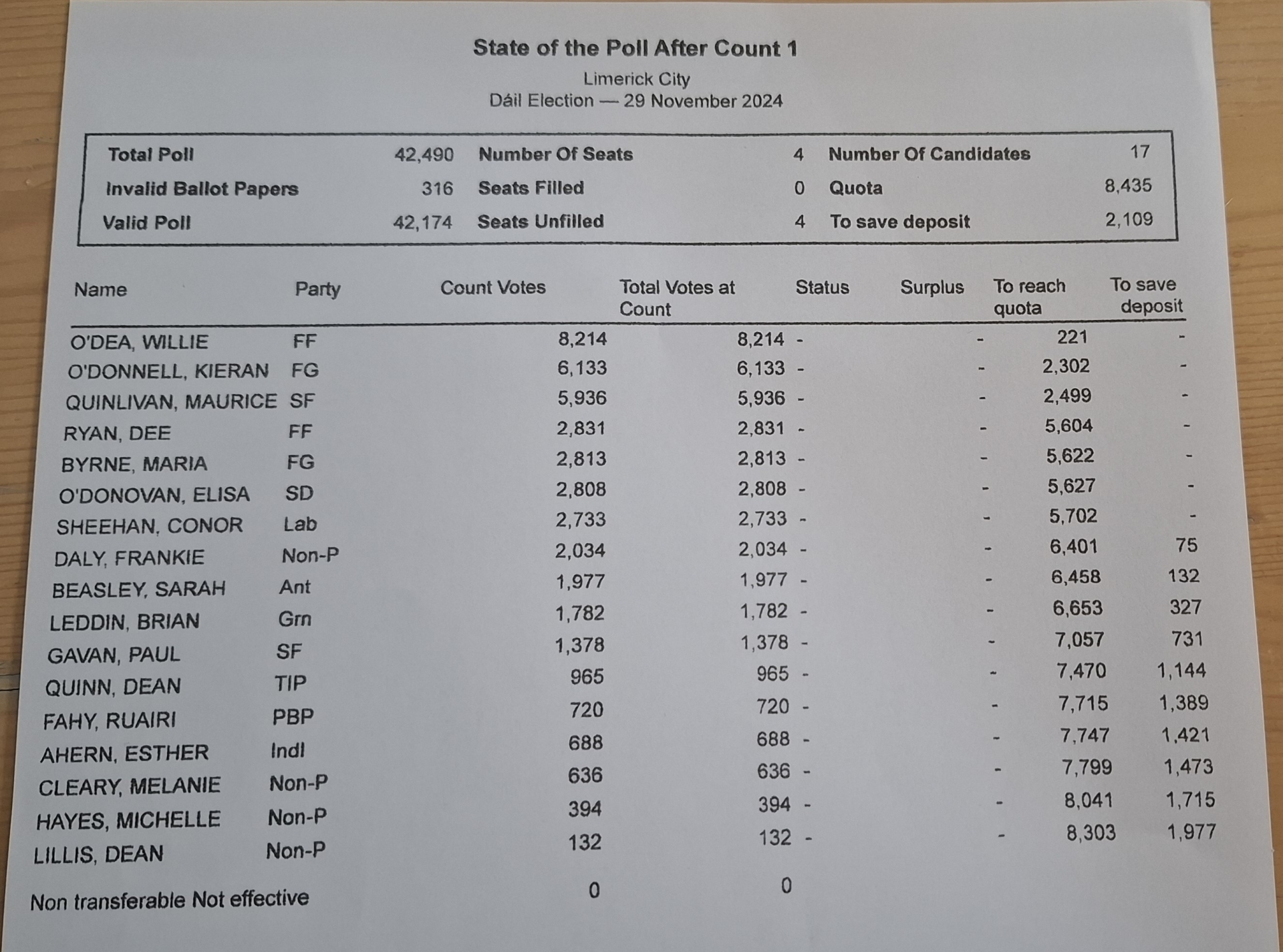 Following the first count (see below) in the Limerick City constituency, no candidate has been elected and the second count is now underway.