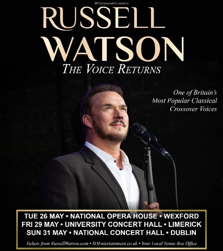 RUSSELL WATSON, classical tenor and crossover artist, known as‘ The Voice’, will be bringing his stage show ‘Russell Watson – The Voice Returns’ to Ireland in 2026 for three performances.