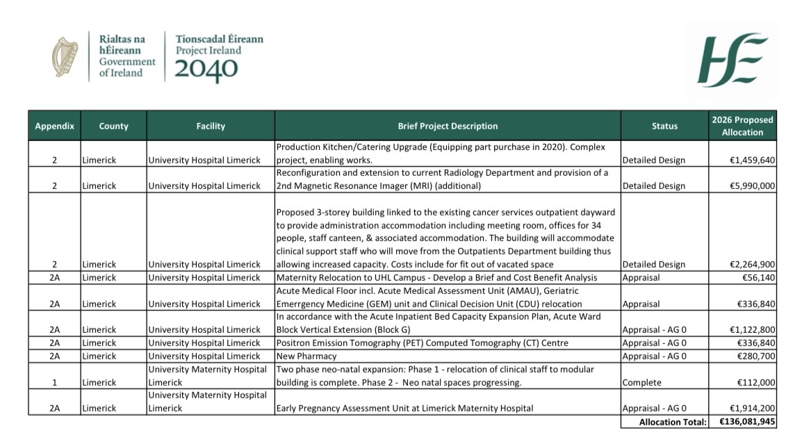 OVER €130 million has been allocated to projects in Limerick under the HSE’s 2026 Capital Plan.