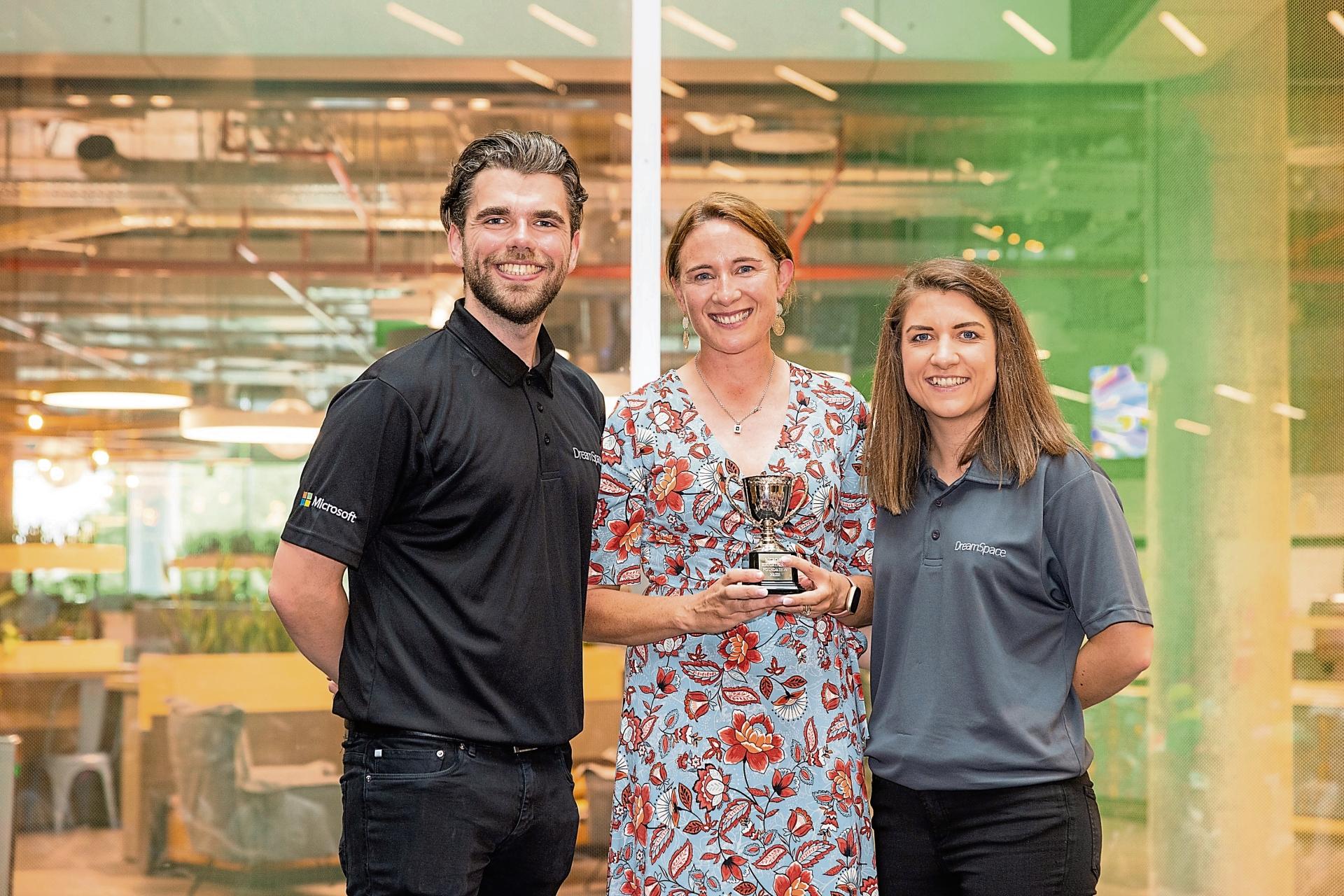 Michael Barrett and Amanda Jolliffe from the Microsoft Dream Space Showcase are pictured presenting the Digital Creativity award to Scoil Bhríde Glen, Co Longford for their STEM-based projec