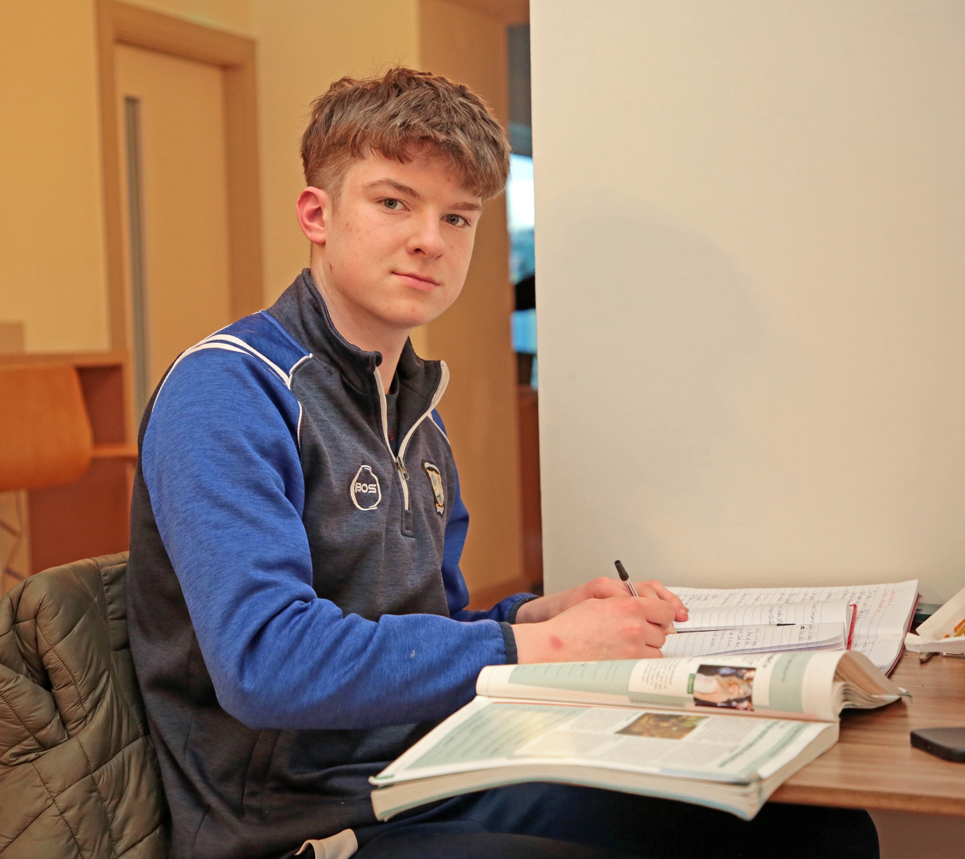 CAPTION: Liam Farrell from Cnoc Mhuire, Granard getting some school work done at Lus na Gréine, a local emergency response hub