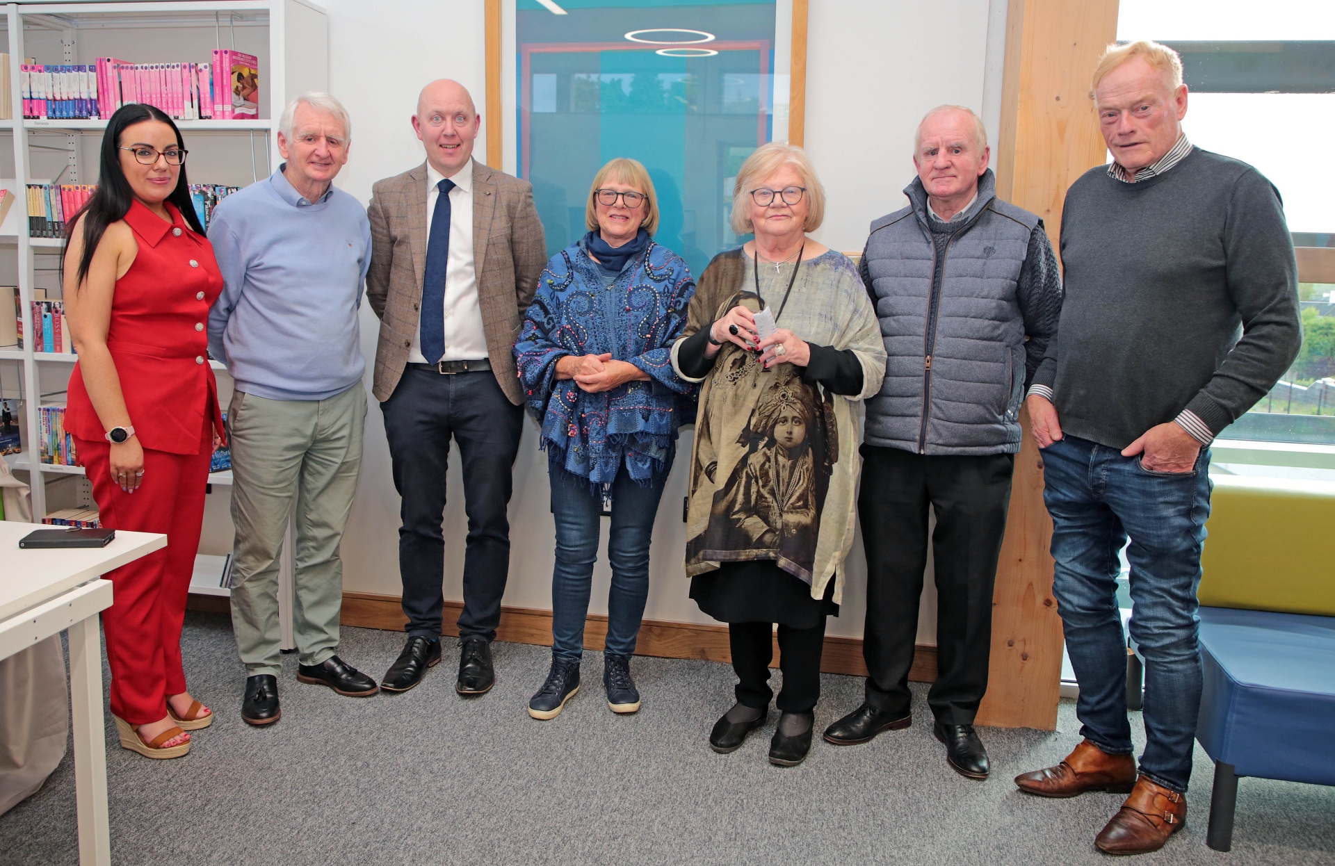 Caption: Assistant Librarian Kim Taylor, Matt Farrell, Cllr Paul Ross, Angela Tuite, Brigid Connaughton, John Farrell, and James Bannon pictured at the unveiling of the painting selected by the Contemporary Irish Art Society which was recently donated to Edgeworthstown Library on behalf of Brigid Connaughton, retiring CIAS board member. Picture: Shelley Corcoran