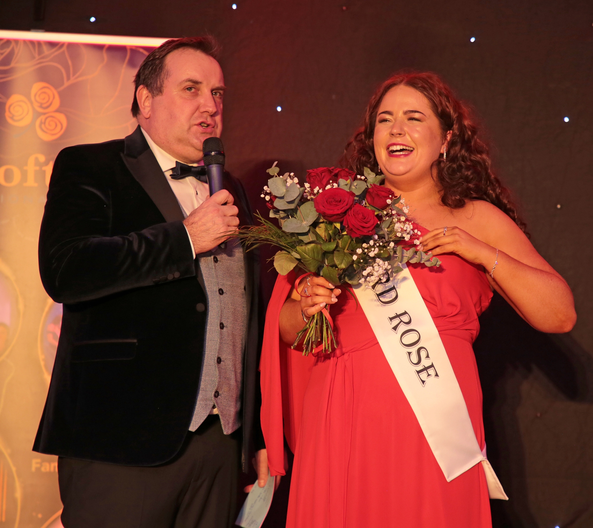 CAPTION: Longford Rose Sara Lee Greene on stage with MC Ollie Turner Picture: Shelley Corcoran