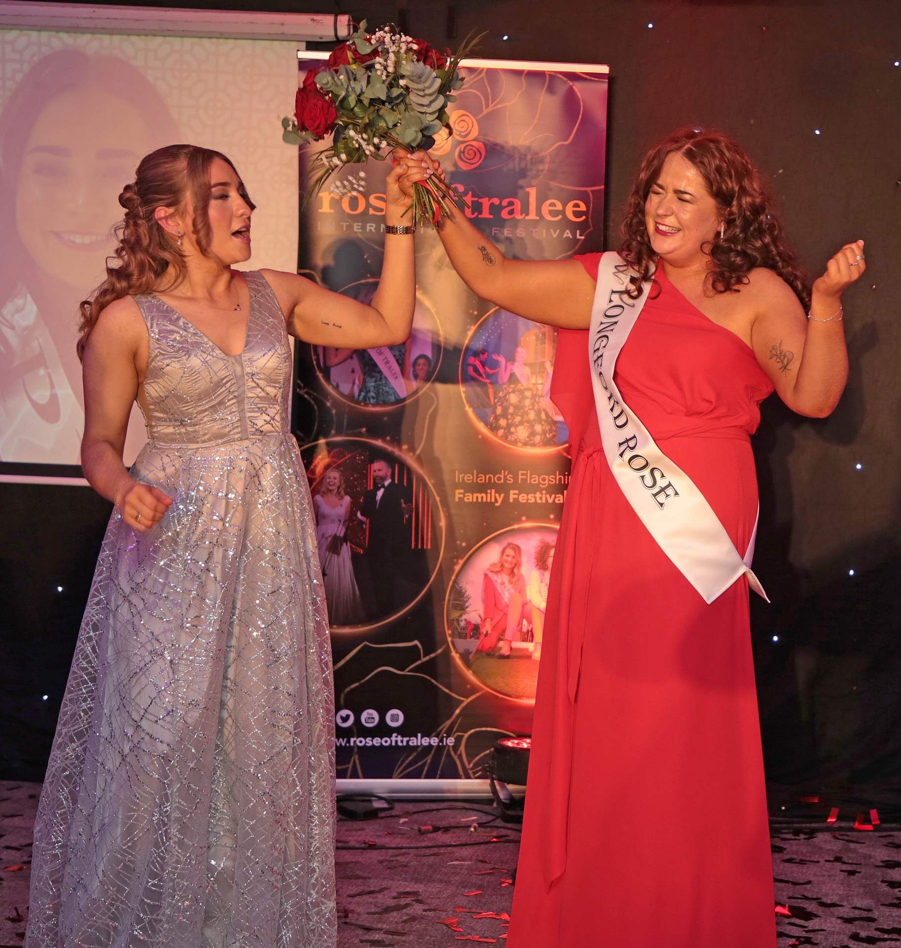 CAPTION: 2023 Longford Rose Grace Kemple and her successor, 2025 Longford Rose Sara-Lee Greene hold a bouquet of Roses aloft at the Longford Arms Hotel on Saturday, January 25 Picture: Shelley Corcoran