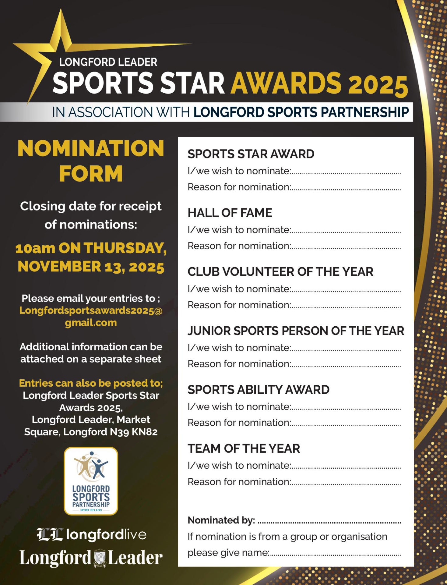 Longford Leader Managing Editor Alan Walsh said, “We are looking forward with great excitement to the 2025 Longford Leader Sports Star Awards, in association with Longford Sports Partnership.”
