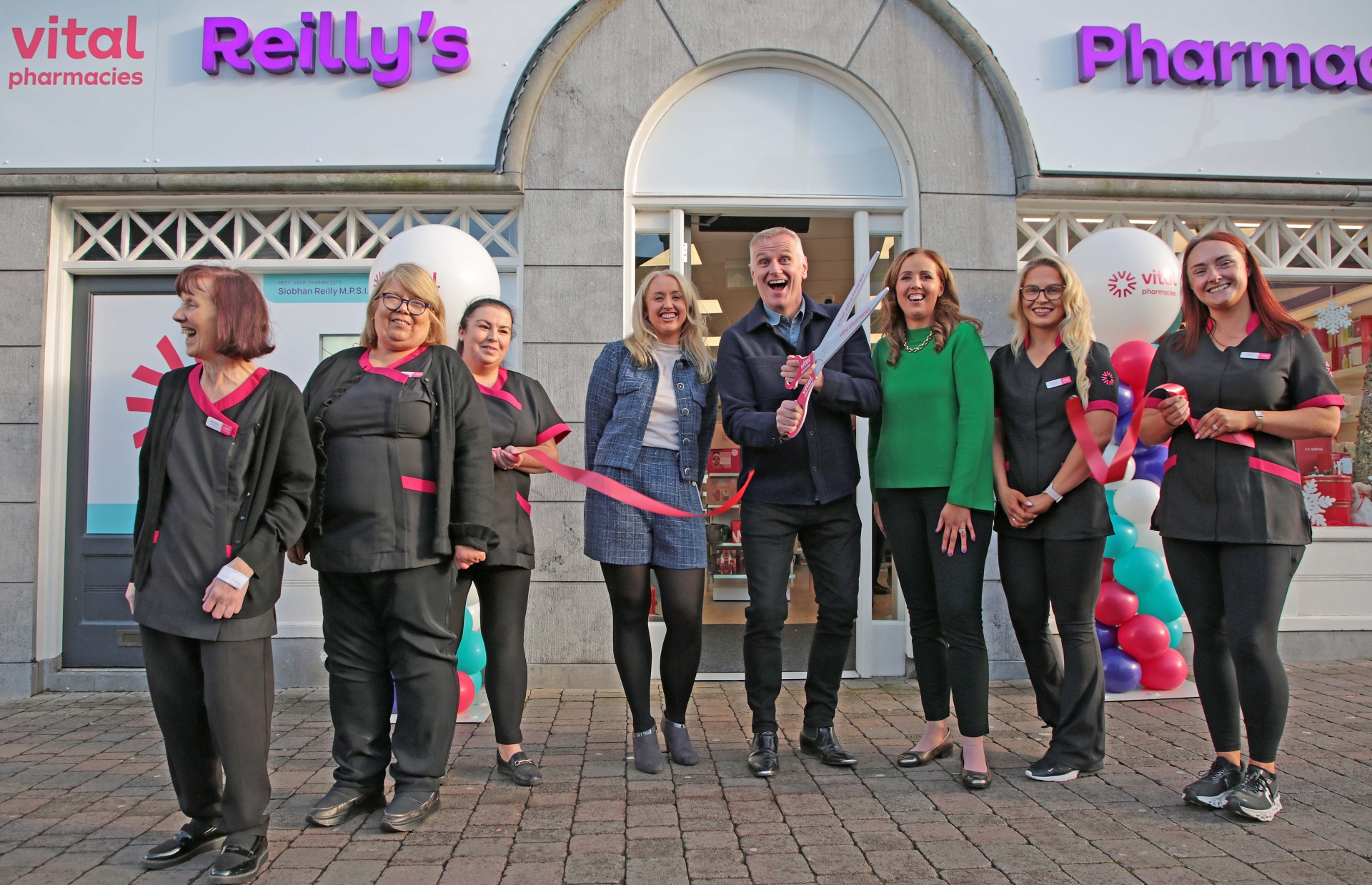 Caption: Special guest Dáithí Ó Sé with Katie, Louise, Celine, Marian, Paula, Siobhán and Helen at Reilly’s Pharmacy as they unveiled their rebranding under the Vital Pharmacies group and celebrated with a vibrant grand opening that drew crowds throughout the day