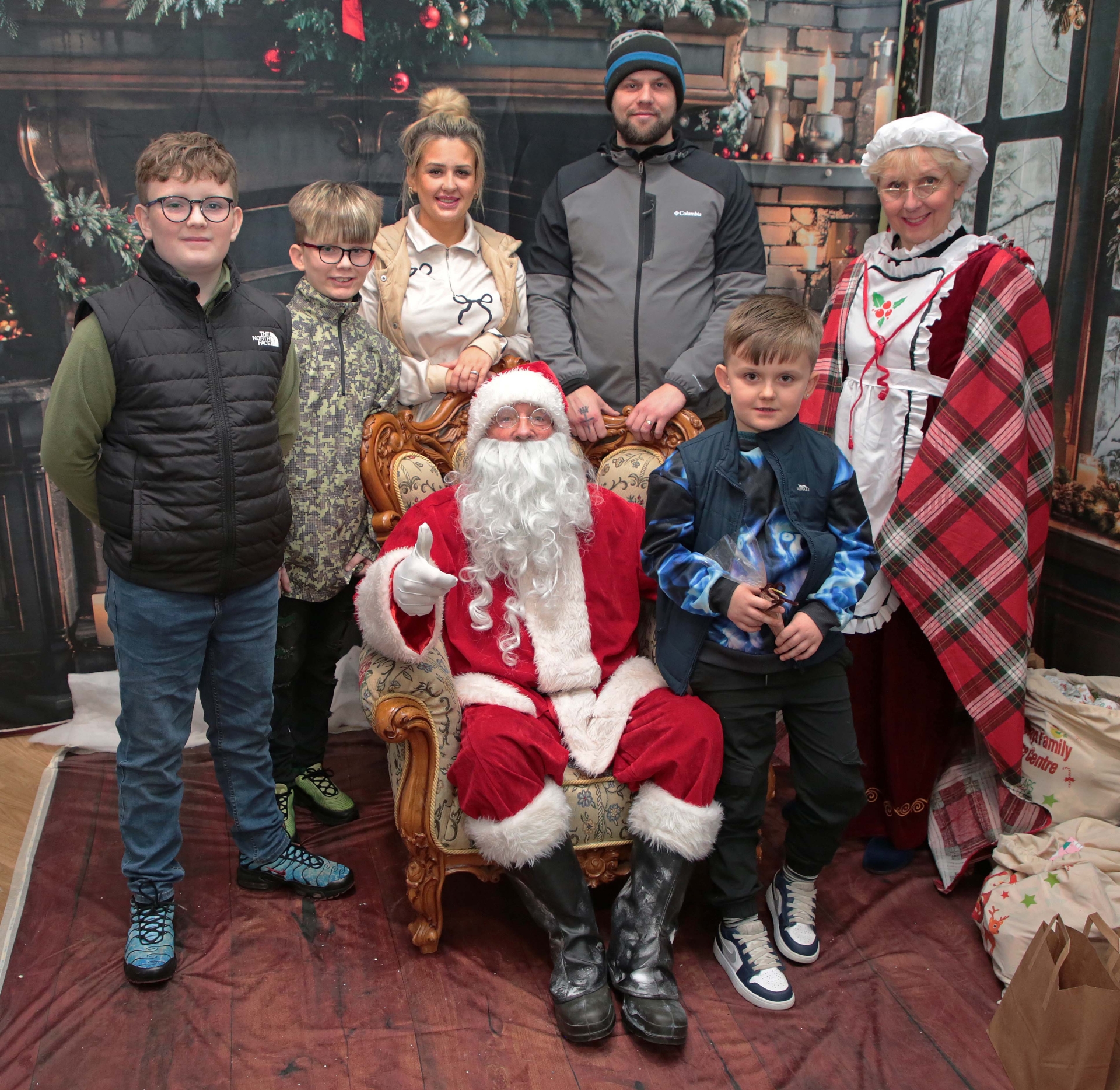 Caption: Stephen, Helen, Justin, Bradley and Joshua Doyle with Mr and Mrs Claus