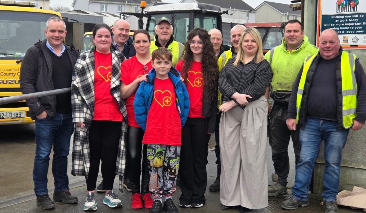 Members of Longford County Council roads staff with Kim Wyse of the Irish Sepsis Foundation, and local advocates Bobbi Yasir, Linda Lowry, and her children Philip and Caitlin Lowry