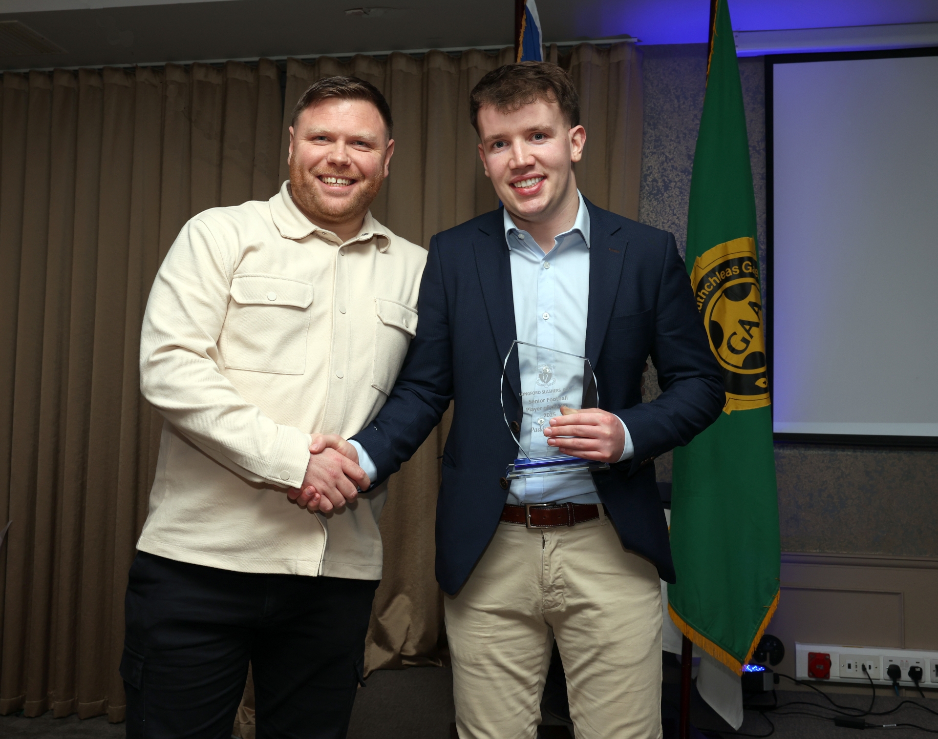 Caption: Senior Player of the Year Paddy Duggan receives his award from Slashers senior football manager Conor Clarke