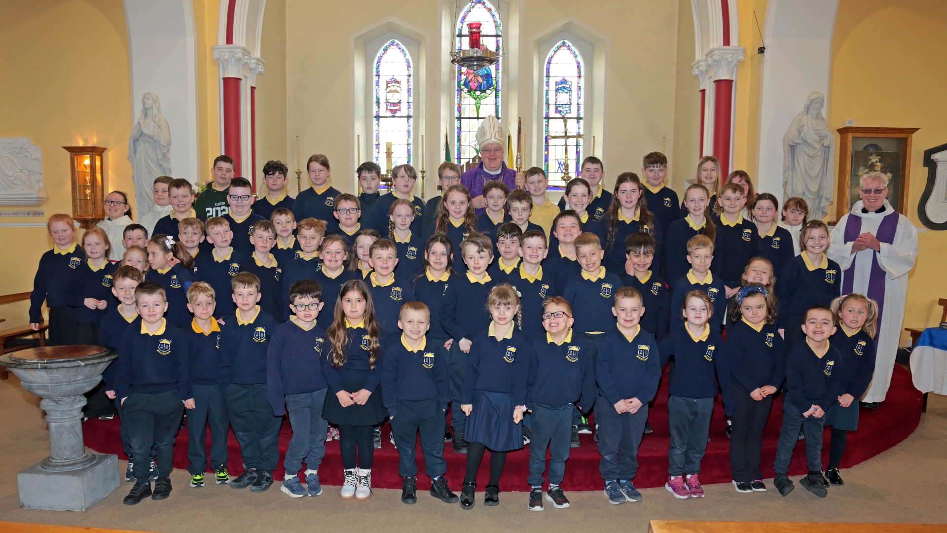 Caption: Lenamore National School celebrated 50 years of providing education and guidance for the young people of Legan parish on Friday, March 20 and to mark the occasion Bishop of Ardagh and Clonmacnois Paul Connell and Fr Vinny Connaughton PP celebrated Mass in St Mary’s Church, Legan followed by a community celebration with refreshments in the school. It was a lovely occasion and pictured are the pupils in St Mary’s Church with Bishop Connell and Fr Connaughton. Picture: Shelley Corcoran