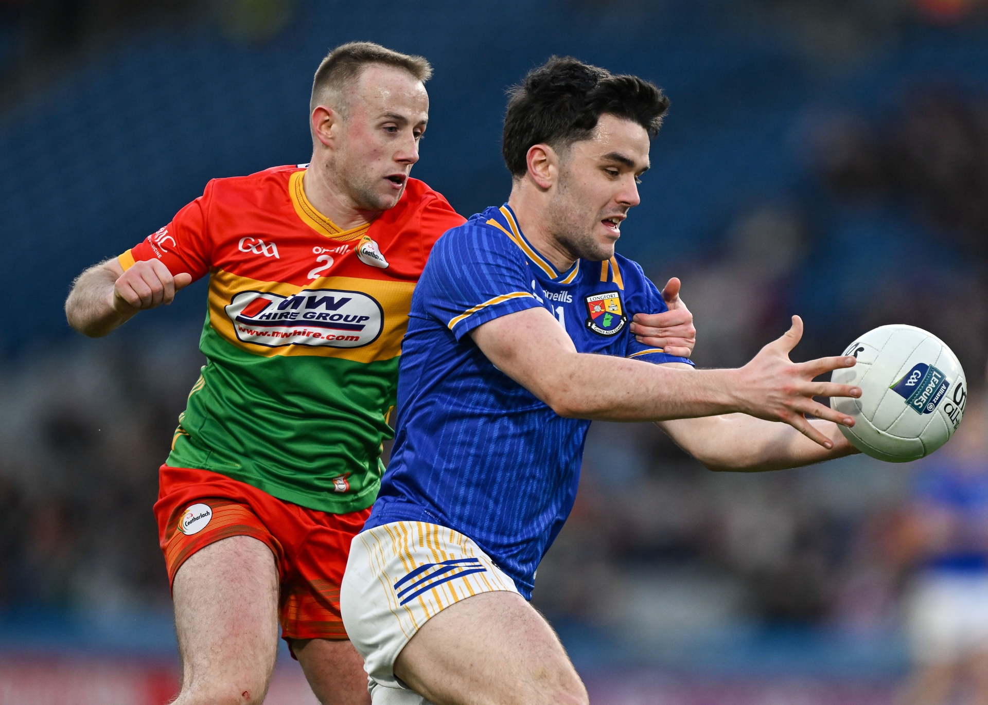Caption: Matthew Carey of Longford in action against Colin Byrne of Carlow during the Allianz Football League Division 4 final match between Carlow and Longford at Croke Park in Dublin. Photo by David Fitzgerald/Sportsfile