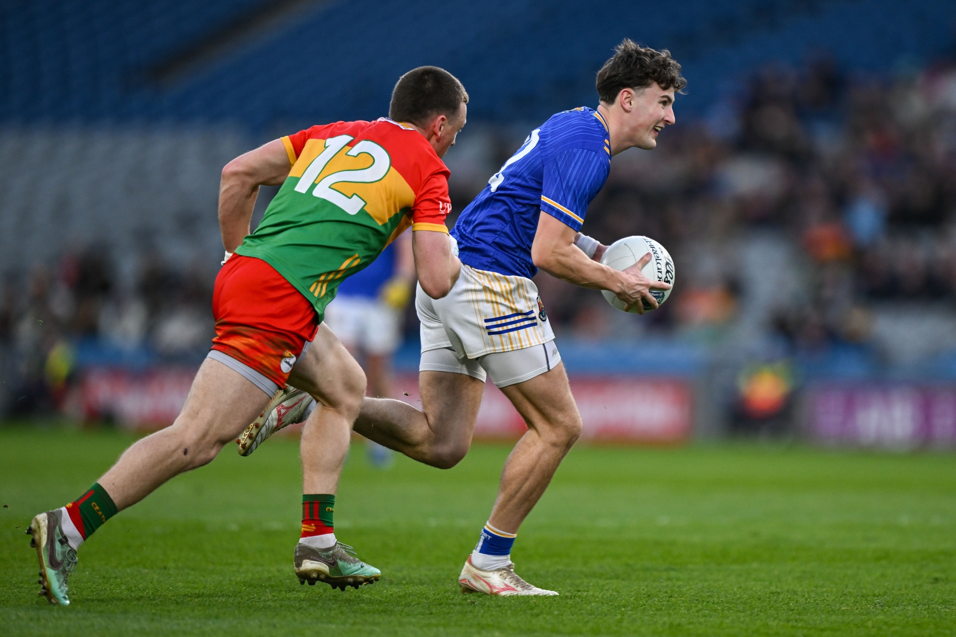 Caption: Daniel Reynolds of Longford in action against Mikey Bambrick of Carlow during the Allianz Football League Division 4 final match between Carlow and Longford at Croke Park in Dublin. Photo by David Fitzgerald/Sportsfile