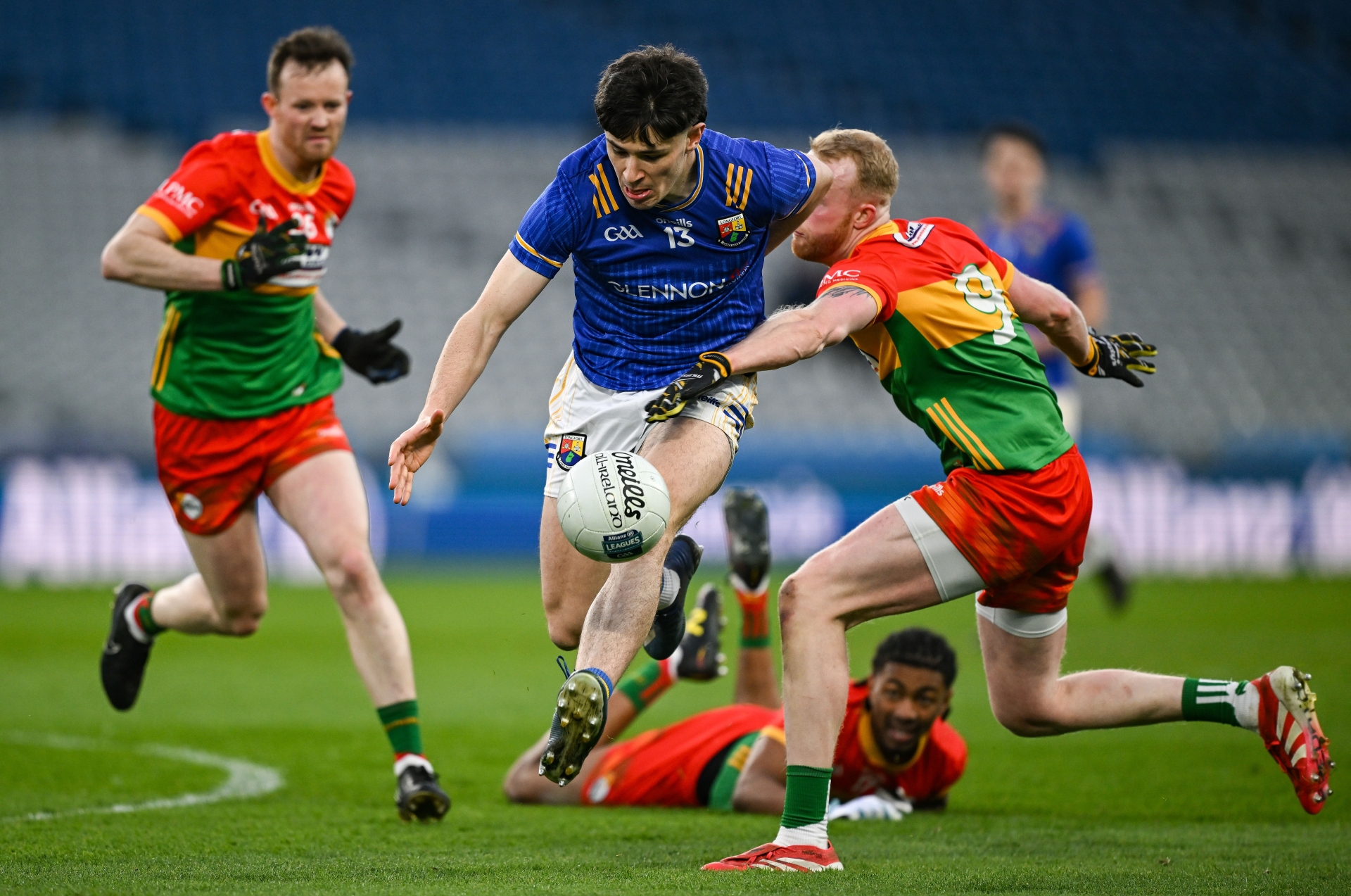 Caption: Dylan Farrell of Longford in action against Conor Doyle of Carlow during the Allianz Football League Division 4 final match between Carlow and Longford at Croke Park in Dublin. Photo by David Fitzgerald/Sportsfile