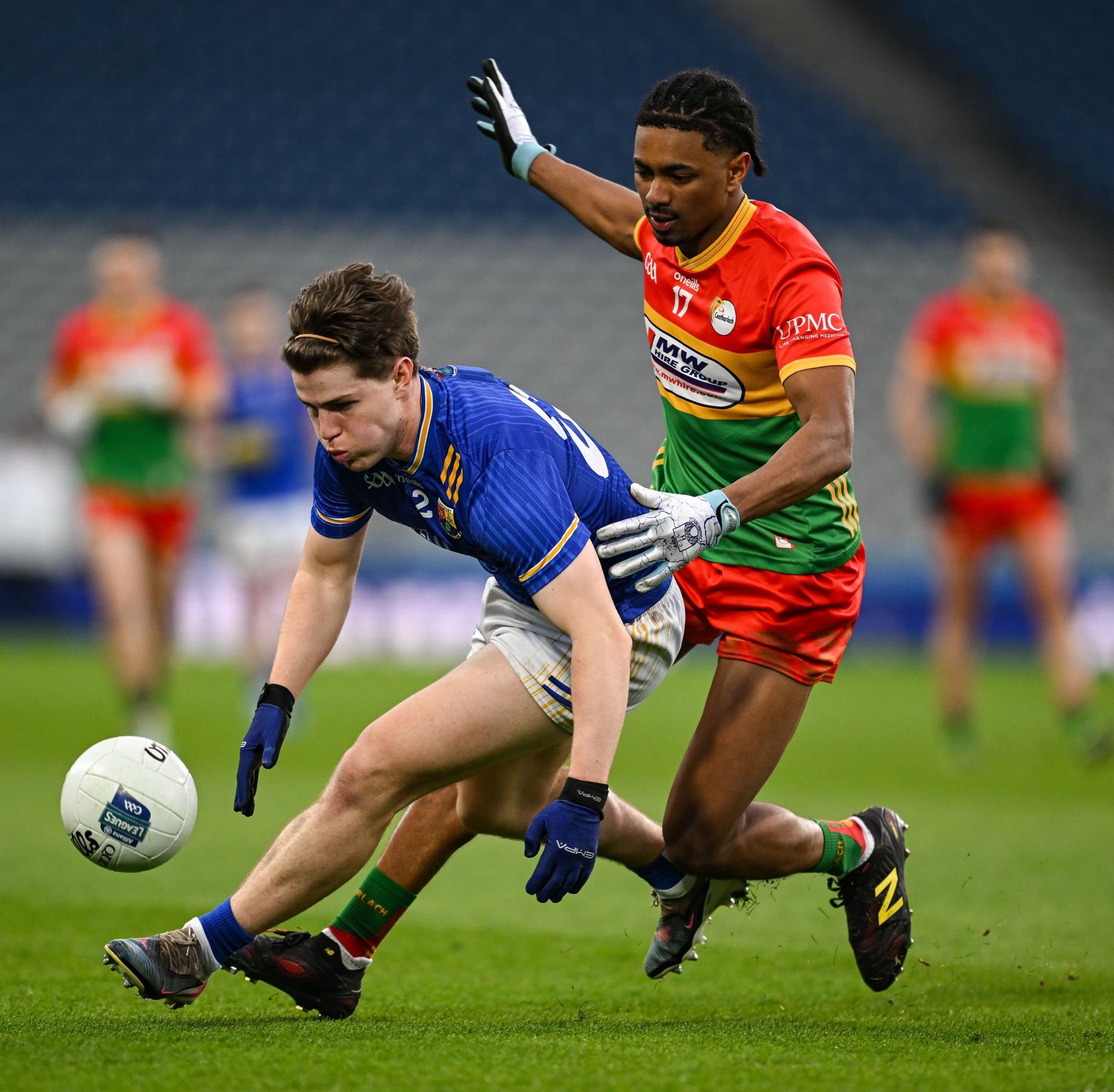 Caption: Paddy Moran of Longford in action against John Phiri of Carlow during the Allianz Football League Division 4 final match between Carlow and Longford at Croke Park in Dublin. Photo by David Fitzgerald/Sportsfile