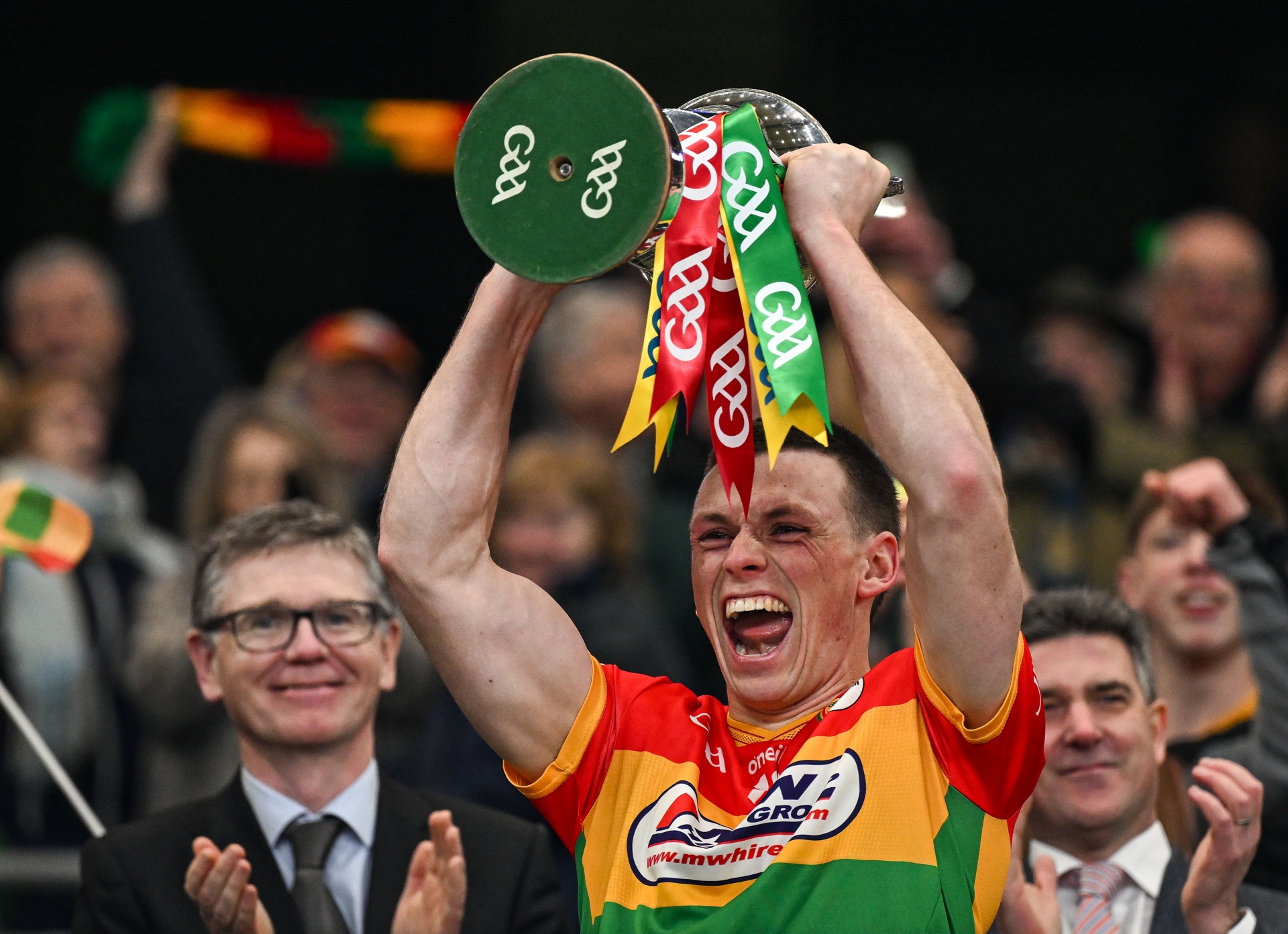 Caption: Carlow captain Mikey Bambrick lifts the cup after the Allianz Football League Division 4 final match between Carlow and Longford at Croke Park in Dublin. Photo by David Fitzgerald/Sportsfile