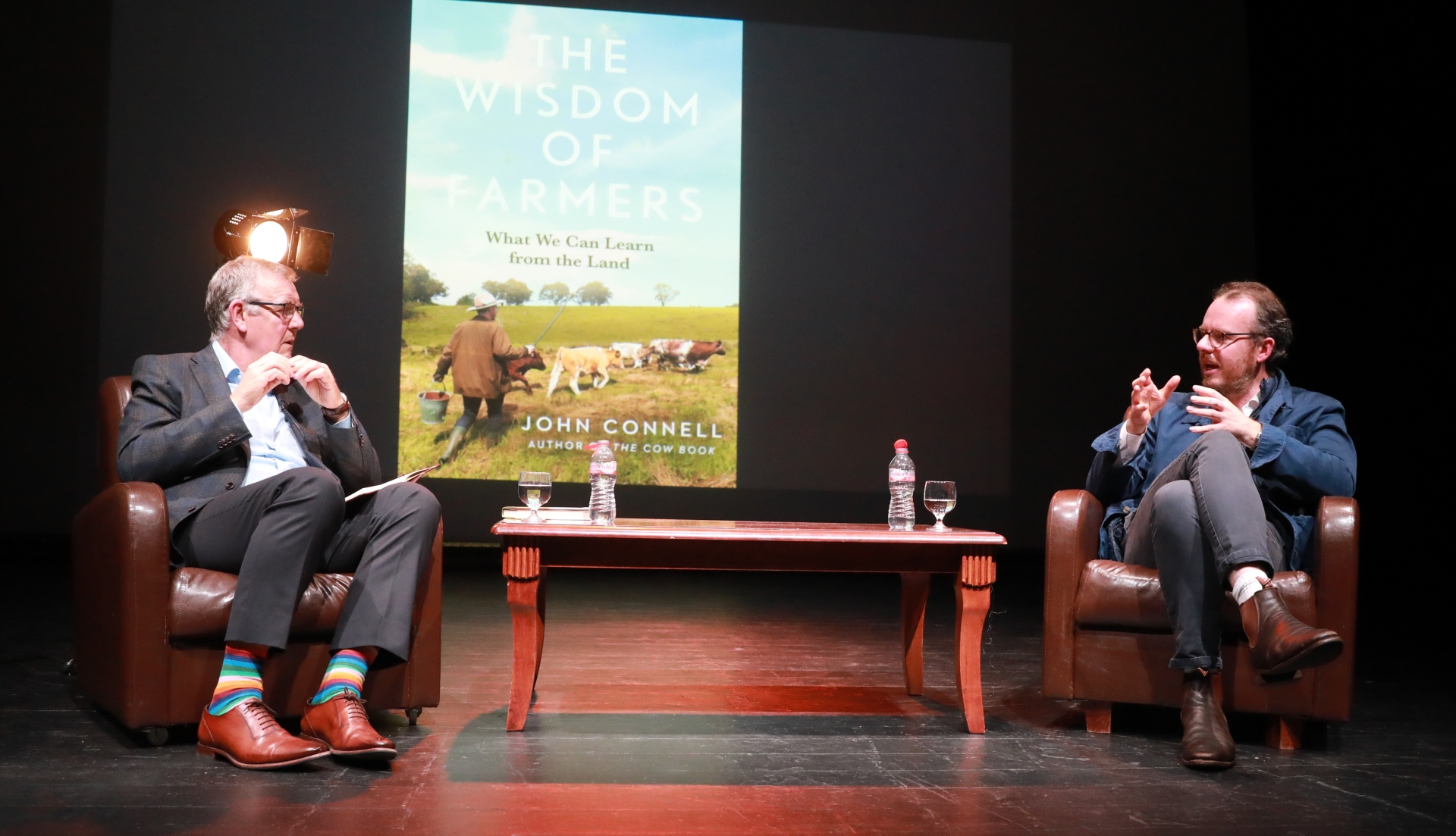 Caption: Former RTÉ news anchor Bryan Dobson and John Connell speaking at the launch of John’s book ‘The Wisdom of Farmers’ in Backstage Theatre on Wednesday, April 8 Picture: Gerry Rowley