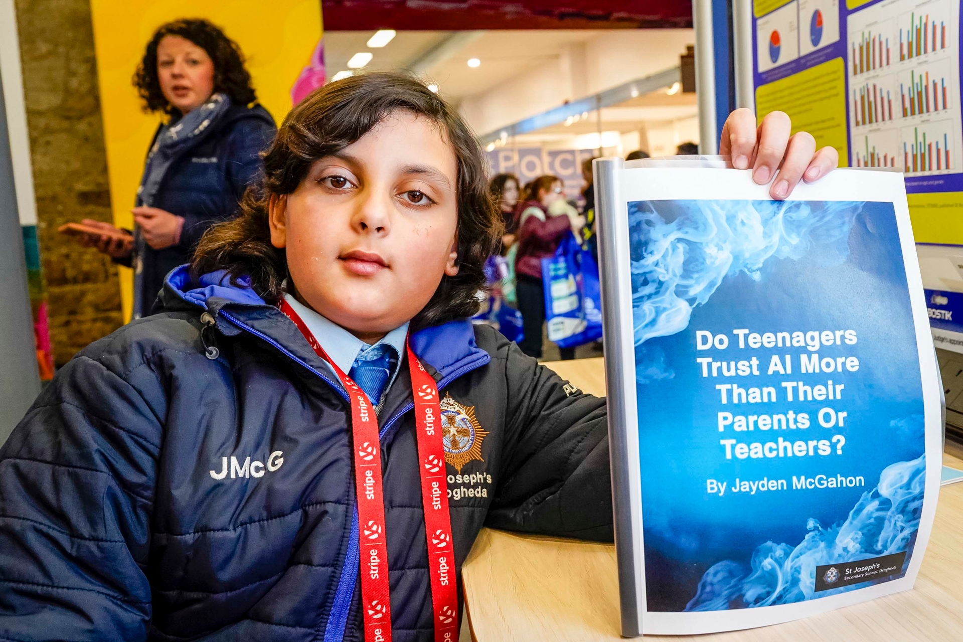 Below: Pictured is student Jayden McGahon from St. Joseph's C.B.S. in Louth, with the project, 'Do Teenagers Trust AI More Than Their Parents or Teachers', at the 2026 Stripe Young Scientist and Technology Exhibition.
