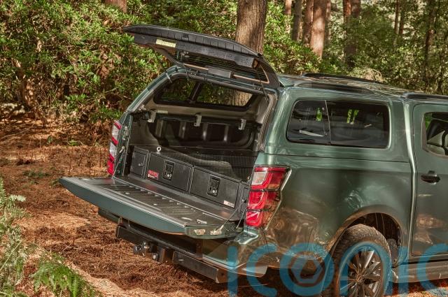The Huntsman accessory pack is available on the flagship V-Cross trim of the D-Max and adds upgrades including an under-rail bed liner, a tow bar with 13-pin electrics, black side steps, black roof rails, 18-inch black alloy wheels, all-terrain tyres, 3D-printed floor mats, a rear canopy and a Gearmate drawer system with keylock.