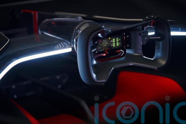 The cabin of the Vision Gran Turismo has been given a clear, minimalist design with transparent materials allowing the driver to see the mechanical components inside the steering wheel.