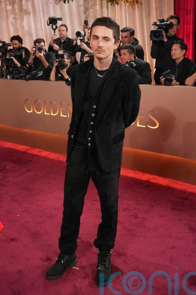 Timothee Chalamet also opted for black in a casual blazer and waistcoat with silver button detailing. The 30-year-old was nominated for best male actor for his performance in Marty Supreme.