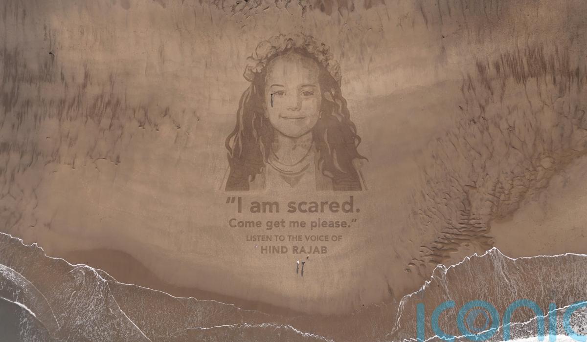 The work which was drawn in Cayton Bay near Scarborough shows the girl, named Hind, with the words: “I am scared. Come get me please. Listen to the voice of Hind Rajab.”