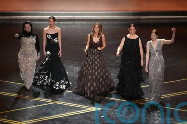 The cast of Bridesmaids including Kristen Wiig, Maya Rudolph and Rose Byrne reunited on stage during the Oscars award ceremony.