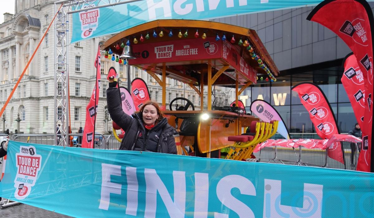 After cycling through York, Leeds, Sheffield, Manchester and Liverpool on a specially adapted 10-person bike with DJ decks, Free completed the challenge on Thursday.