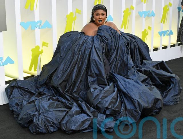 Lizzo made an entrance wearing a blue-black Jean Paul Gaultier gown and copious gold jewelry including a large lip ring.
